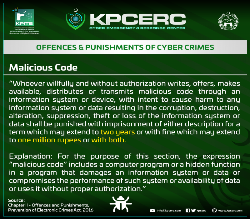 “Whoever willfully and without authorization writes, offers, makes available, distributes or transmits malicious code through an information system or device, with intent to cause harm to any information system or data resulting in the corruption, destruction, alteration, suppression, theft or loss of the information system or data shall be punished with imprisonment of either description for a term which may extend to two years or with fine which may extend to one million rupees or with both. Explanation: For the purpose of this section, the expression “malicious code” includes a computer program or a hidden function in a program that damages an information system or data or compromises the performance of such system or availability of data or uses it without proper authorization.”